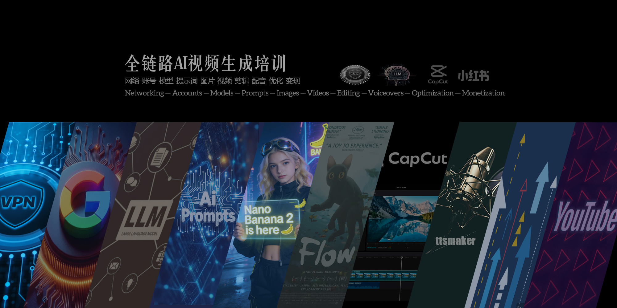 课程涵盖网格账号生成,模型选择,提示词技巧,图像生成、视频创作、视频剪辑、音讯配音,优化与变现全链路环节,